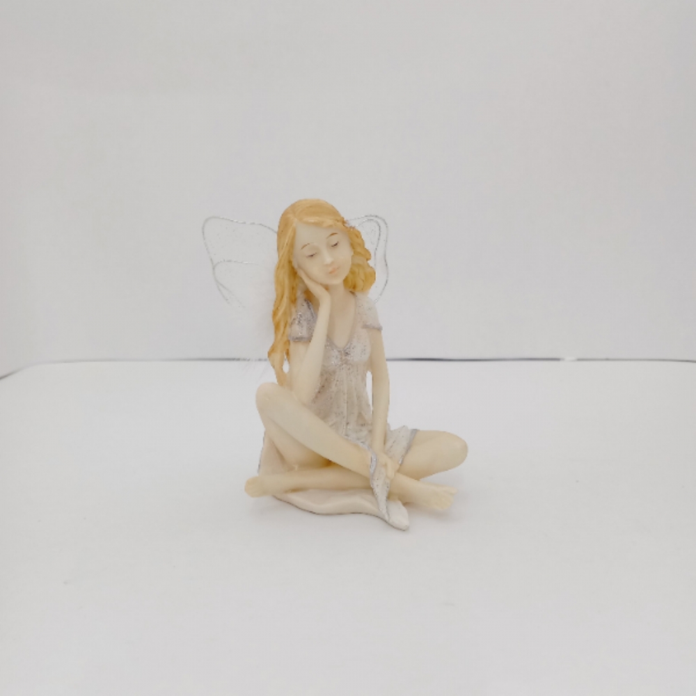 La fatina è seduta in posizione pensierosa, con gli occhi chiusi. Il suo vestito è bianco con glitter argentati.
