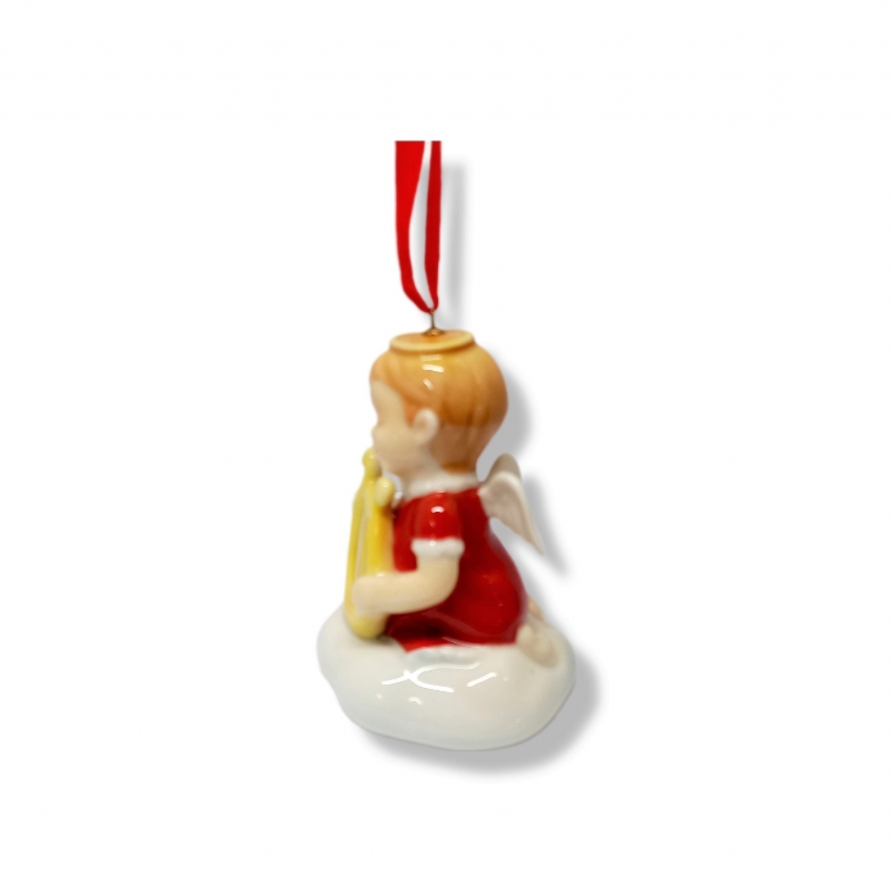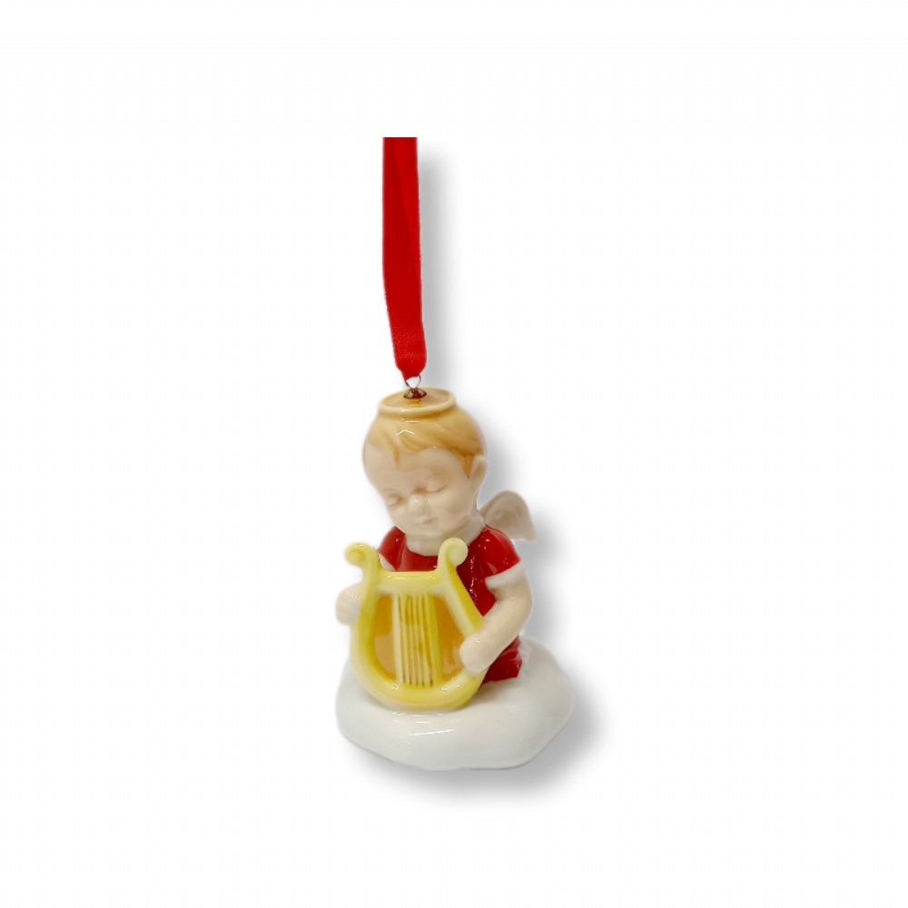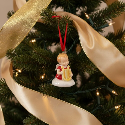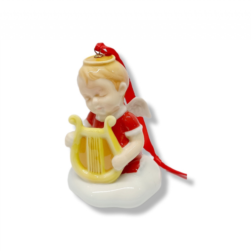 Questo finissimo addobbo ritrae un Angioletto seduto su una nuvola, mentre suona una delicata arpa. L'eleganza della forma e la lucentezza della Porcellana Franz ne fanno un punto focale che riflette splendidamente le luci dell'albero.