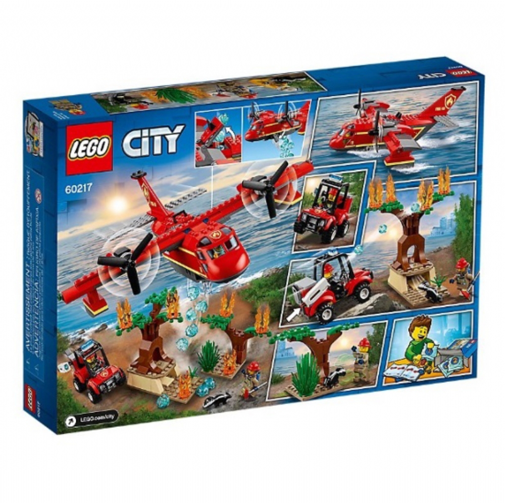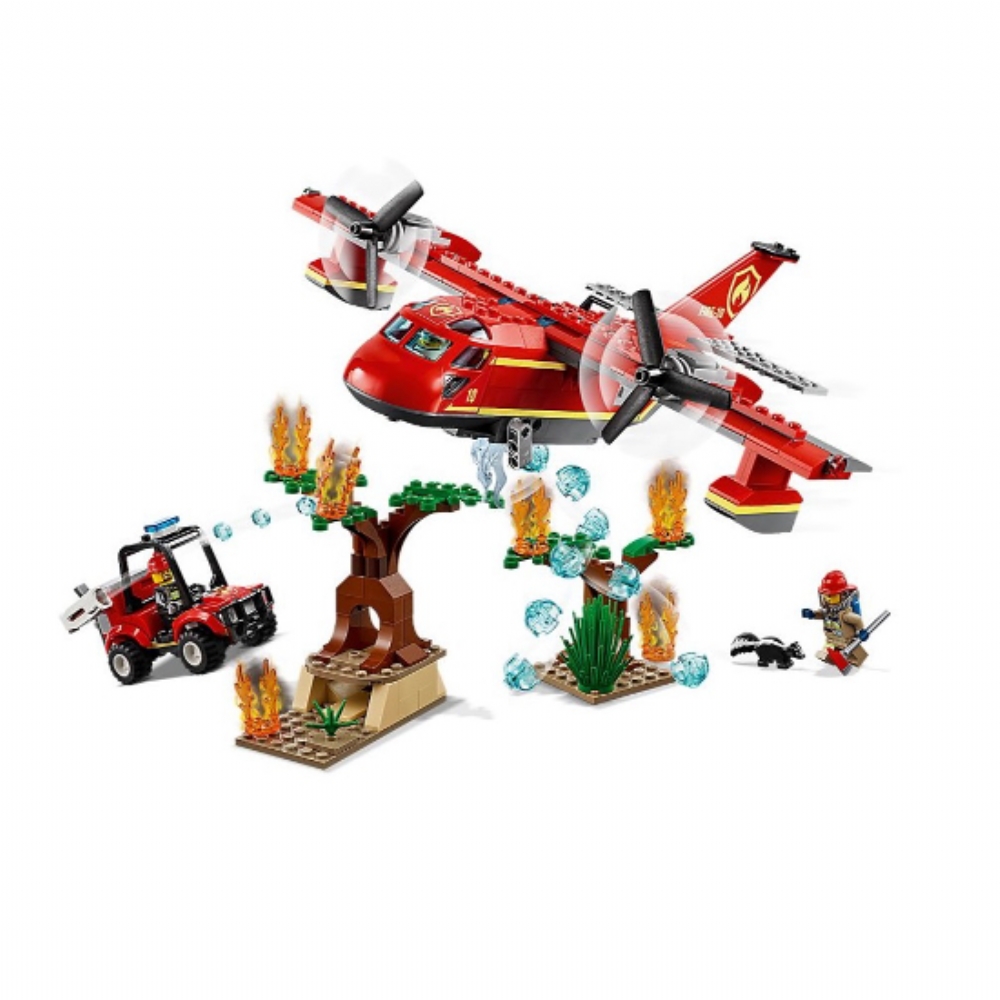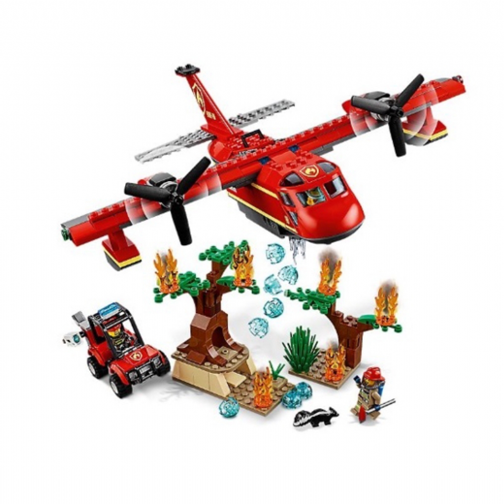 La confezione comprende un aereo antincendio a doppia elica con galleggianti, con cabina di pilotaggio apribile, portello superiore per caricare l'acqua e la leva per farla cadere.