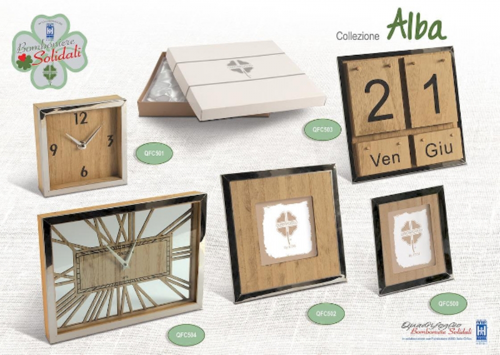 Portafoto con cornice in legno e bordo in metallo.
