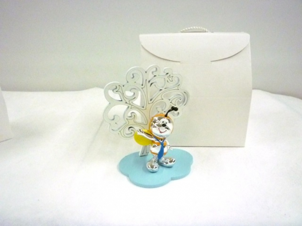 ALBERO IN LEGNO BIANCO CON BASE CELESTE ARRICCHITA DA PERSONAGGIO IN RESINA APINA GIALLO-ARGENTO