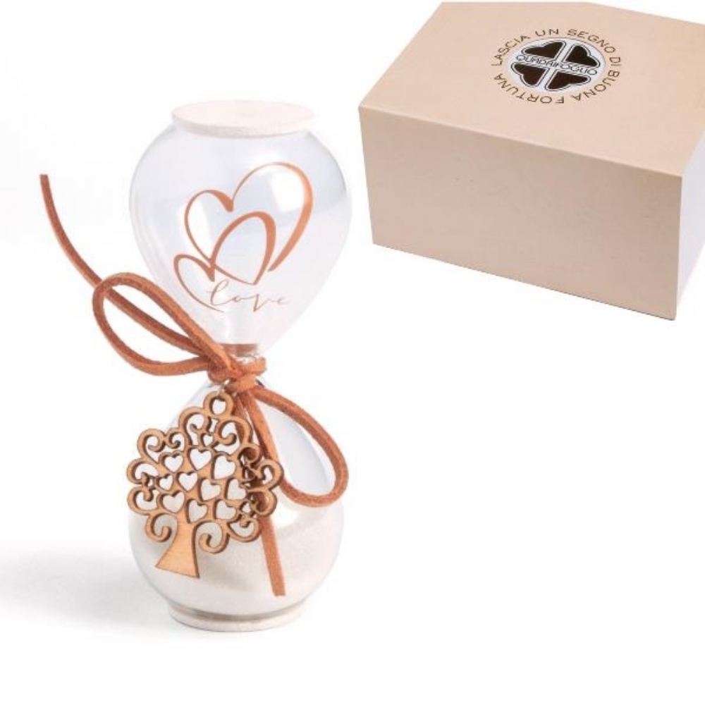 Clessidra in vetro con decorazione cuore ed applicazione albero della vita in legno.