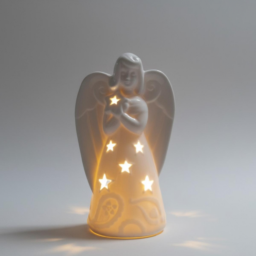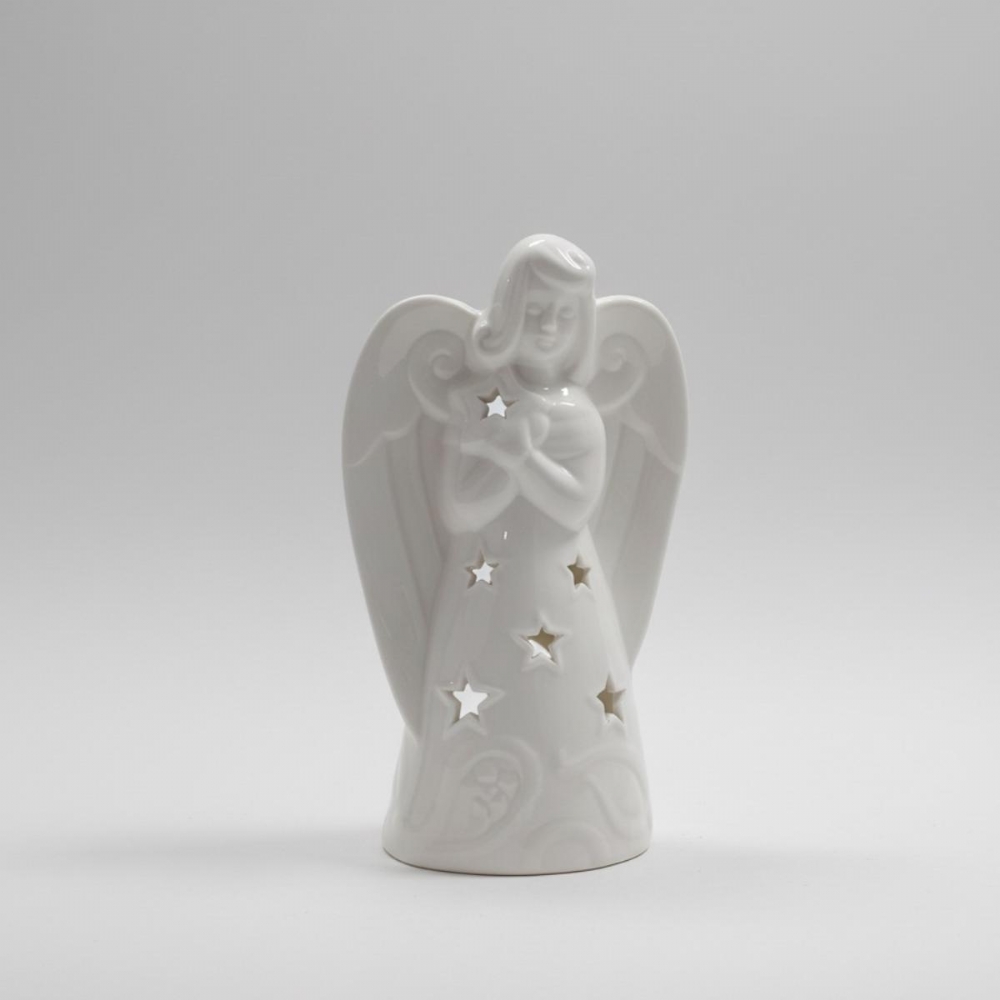 La figura, alta 19 cm, è caratterizzata da un design elegante con intagli a forma di stella sul vestito e tra le mani giunte in preghiera. Questi fori permettono alla luce calda del lumino Tea Light (incluso) di filtrare, creando un'atmosfera serena e accogliente e un delicato effetto di luce puntinata sulla superficie d'appoggio. La porcellana lucida aggiunge un tocco di lusso e purezza.