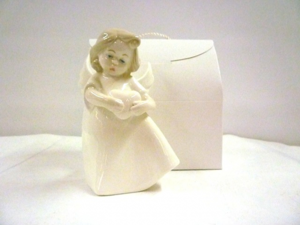 ANGELO IN PORCELLANA CHE TIENE TENERAMENTE TRA LE BRACCIA UN BELLISSIMO CUORE ROSA.
