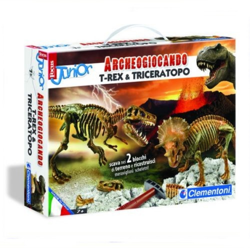 Un vero kit da archeologo completo di martello, scalpello e spatola per scovare gli scheletri di affascinanti animali preistorici, come il terribile T-Rex e il Triceratopo , e per studiarne tutte le caratteristiche. Nella confezione il bambino troverà due blocchi di terreno da scavare per trovare tutti i reperti, assemblare i diversi componenti e studiarne le caratteristiche, attraverso le ricchissime schede Identikit!