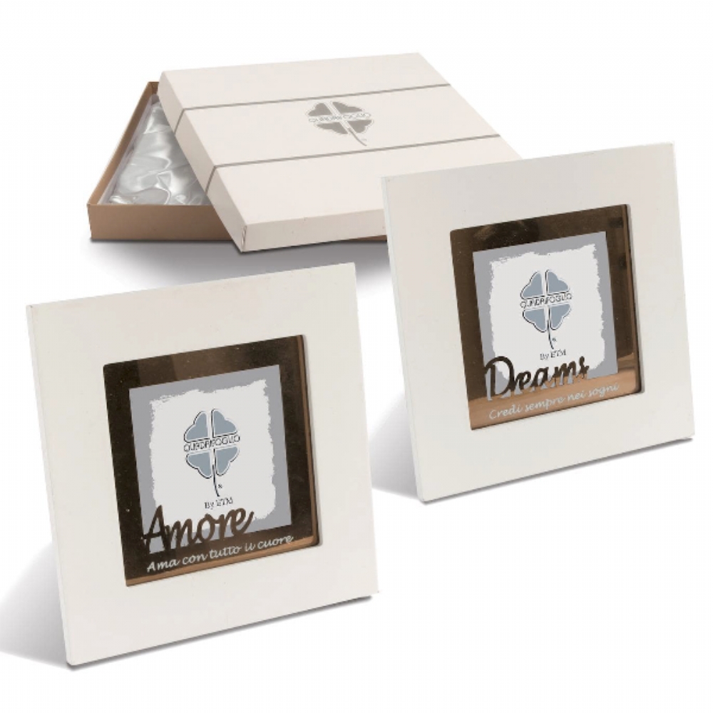 Portafoto in legno bianco con inserti in metallo, assortito in due versioni: una con la scritta "Dreams - Credi sempre nei sogni" e l'altro con la scritta "Amore - Ama con tutto il cuore"