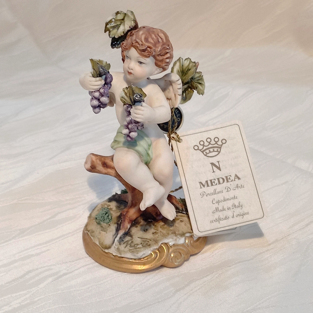 Statuina in Porcellana di Capodimonte "Autunno su Albero" - Cherubino con Uva - Collezione La Medea