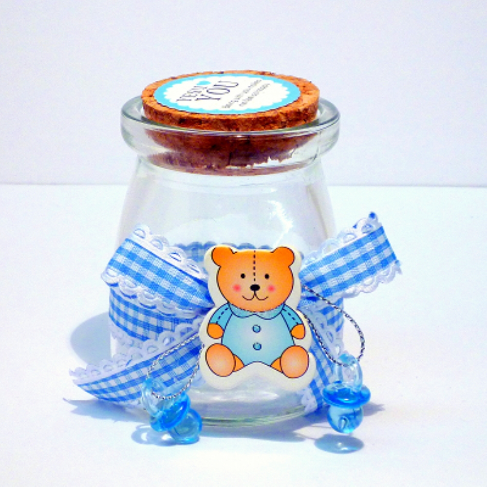 Vasetto in vetro trasparente con applicazione orsetto celeste, ideale come portaconfetti.