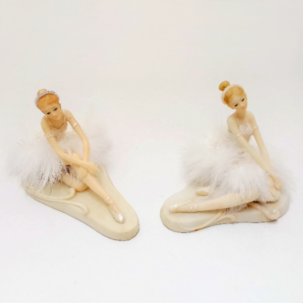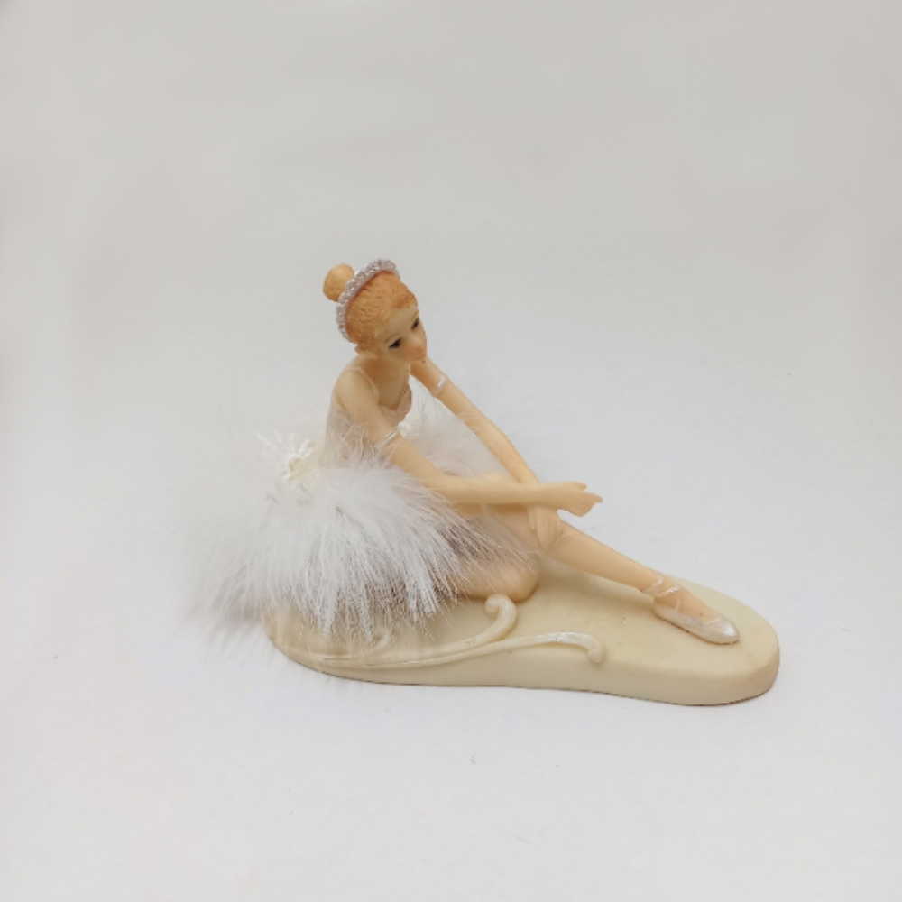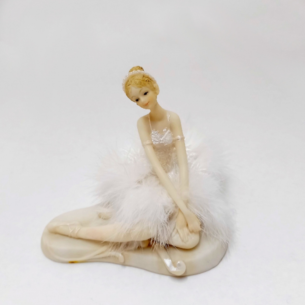 Ballerina seduta in resina con la gonnellina del tutù in piume bianche