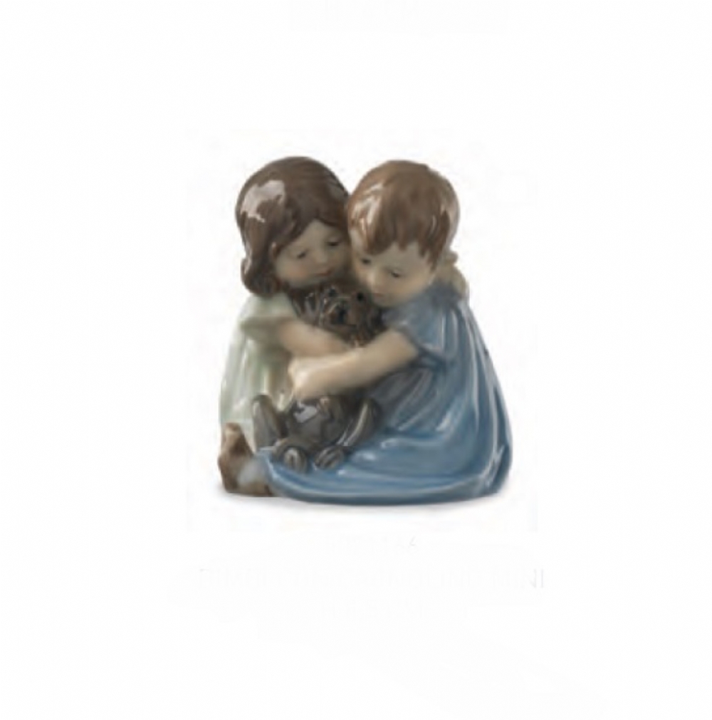 Statuina Royal Copenhagen realizzata in porcellana dipinta a mano. Rappresenta una coppia di bambini che abbracciano un cagnolino. Fa parte della serie "mini".