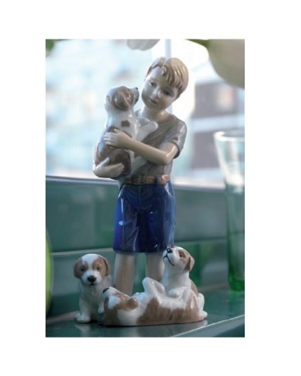 Statuina Royal Copenhagen realizzata in porcellana dipinta a mano. Fa parte della serie dedicata ai bambini con gli animali. Essa raffigura un ragazzino con i cuccioli.