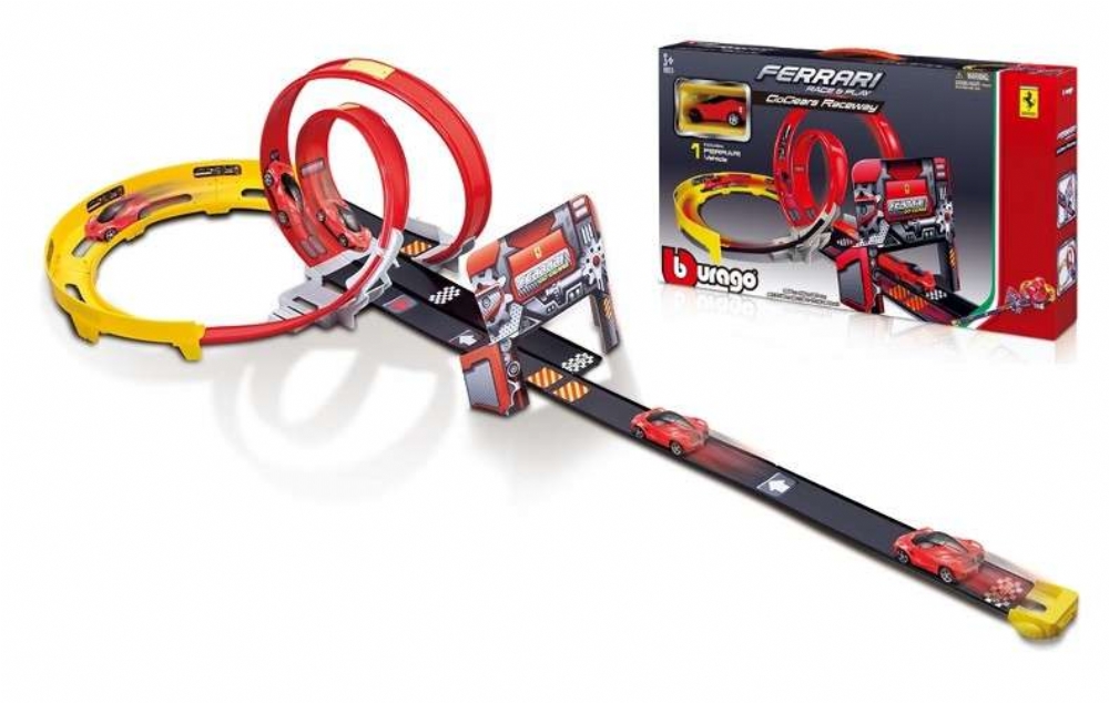 DescrizioneEcco la Pista Raceway Ferrari: una pista con lanciatore e doppio loop, include 1 veicolo Ferrari a retrocarica Go Gears, stickers ed elementi grafici inclusi.