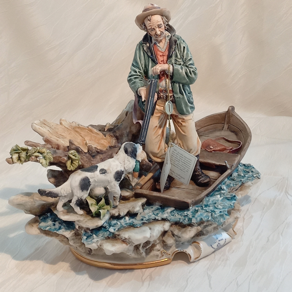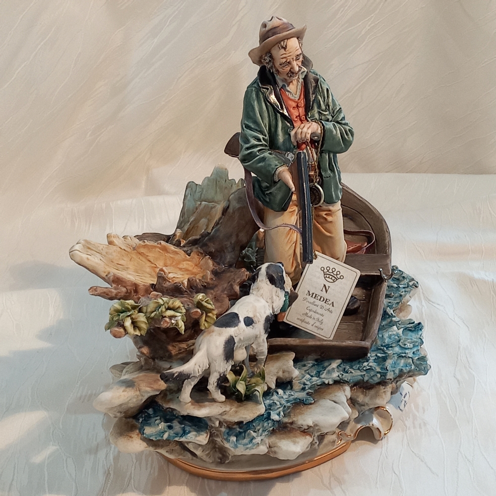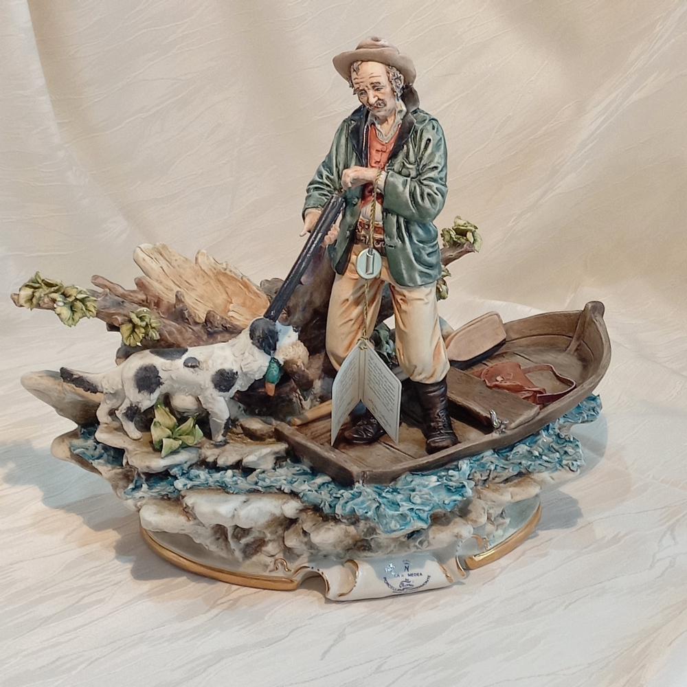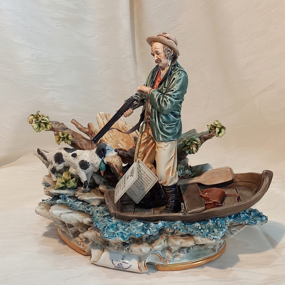 Immergiti in una dinamica scena di caccia con questa imponente scultura in porcellana di Capodimonte, una vivace creazione de La Medea. Realizzata e dipinta a mano con la maestria che celebra la tradizione ceramica napoletana, quest'opera cattura un cacciatore a bordo di una piccola imbarcazione, accompagnato dal suo fedele cane, nel momento del recupero di una preda.