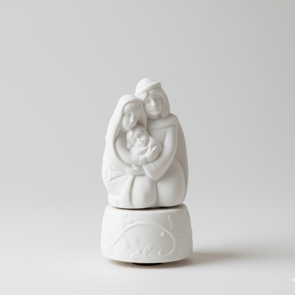 Fede, Arte e Dolce Melodia: Il Carillon Sacra Famiglia in Porcellana Biscuit (H 15 cm).