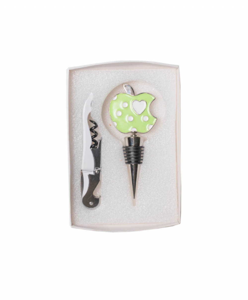 Set composto da cavatappi in metallo + tappo per bottiglia con inserto smaltato a forma di mela verde.