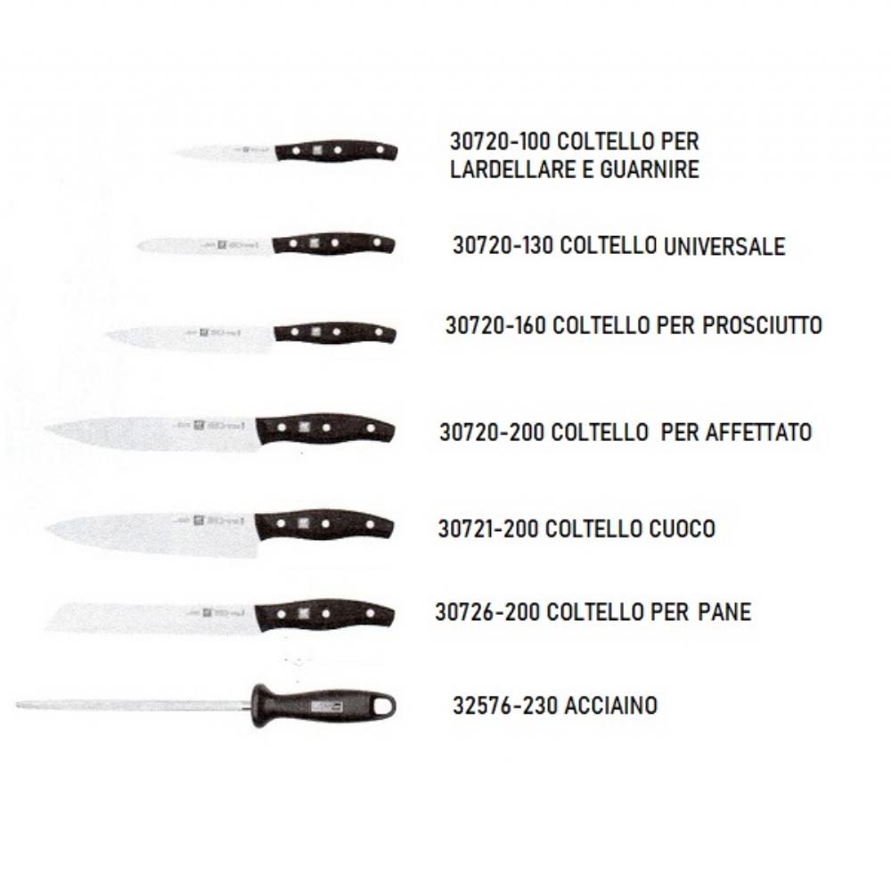 La confezione contiene un ceppo,coltello per lardellare e guarnire; coltello universale; coltello per prosciutto; coltello da carne; coltello da cuoco, coltello da pane ed acciaino.