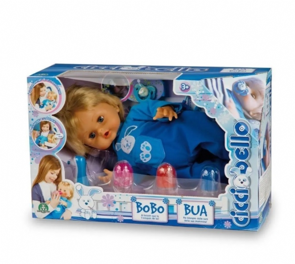 Cicciobello Bua: un bebé interattivo che piange, ride e si ammala, e ha bisogno delle cure della sua mamma. Trova la medicina migliore per una pronta guarigione utilizzando i biberon con le medicine compresi nella confezione. Un'esperienza di gioco coinvolgente che stimola l'immaginazione e l'affettività. Perfetto come idea regalo per bambini.