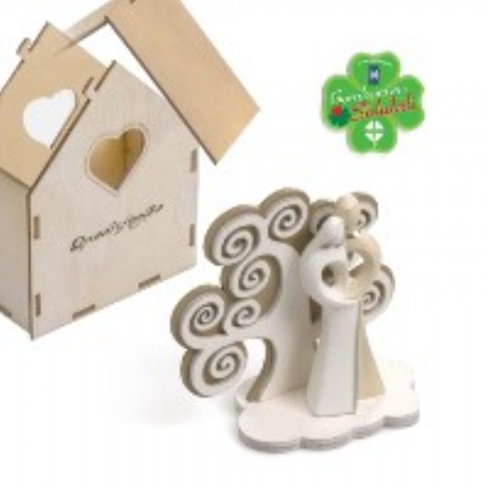 Scatola bomboniera originalissima, in legno a forma di casetta con logo sulla parte anteriore.