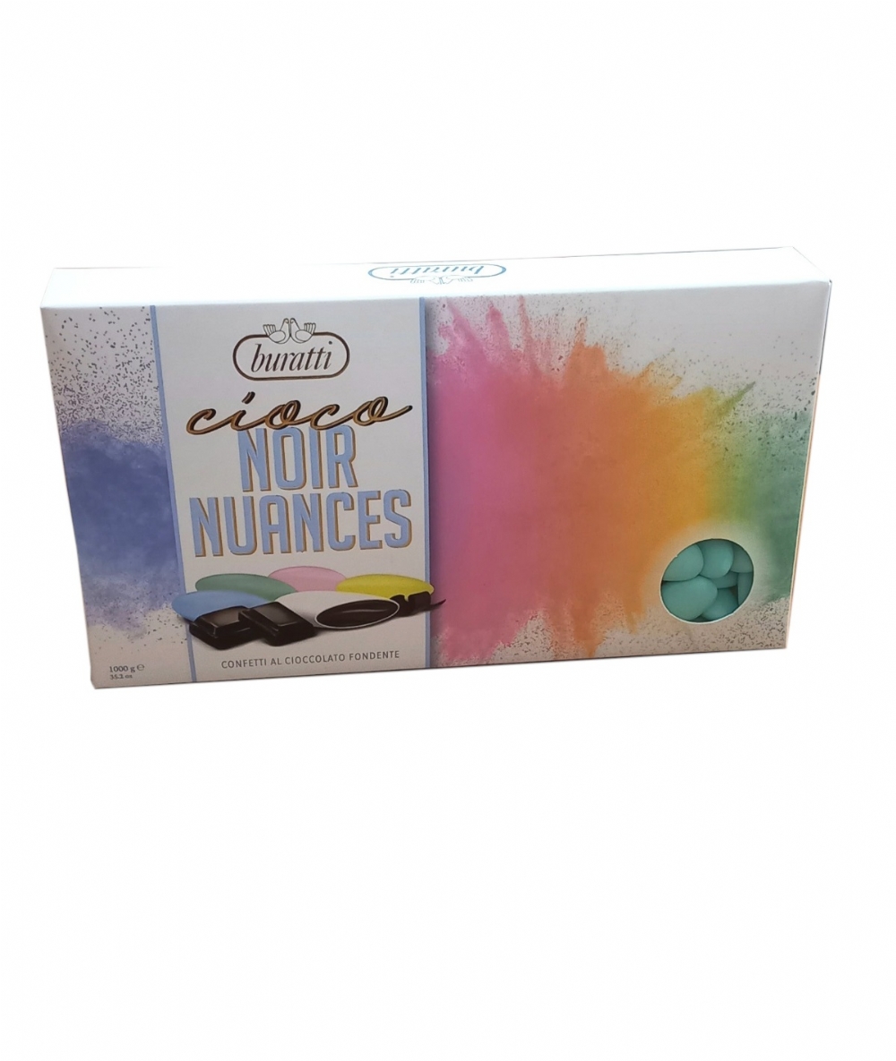 Pregiati confetti finissimi al cioccolato fondente, colorati nelle nuove nuance color tiffany.