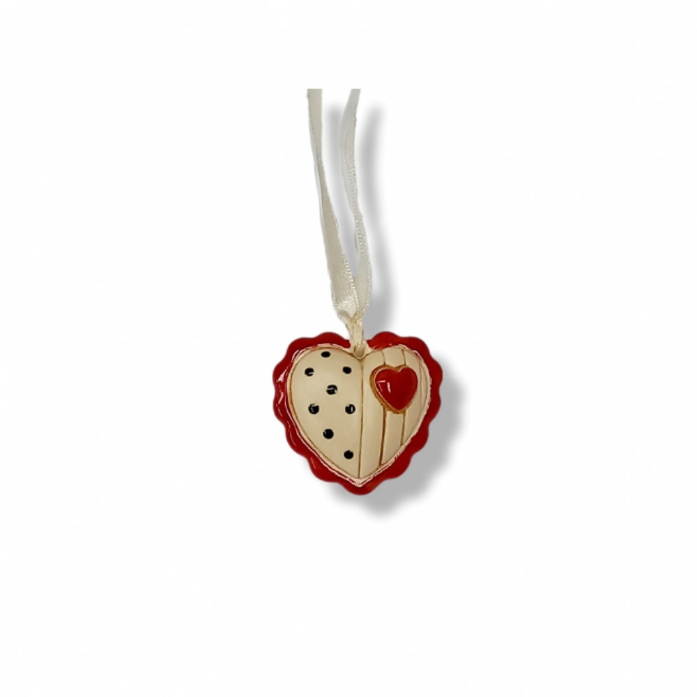 Ogni cuoricino è un piccolo capolavoro di design 3D, con una base in ceramica lucida che ne esalta la tridimensionalità. È dipinto a mano con un bordo rosso brillante che incornicia il corpo centrale, decorato con motivi giocosi e classici come pois o piccoli cuori in rilievo, come mostra l'immagine di riferimento. Questo design stratificato e l'uso di colori intensi (rosso e panna) lo rendono un addobbo estremamente vivido e accattivante, in perfetto stile alpino.