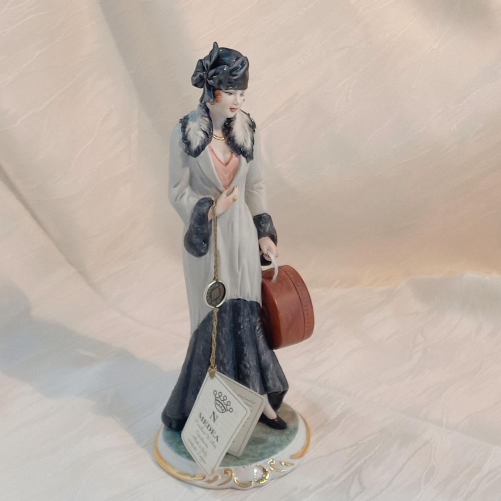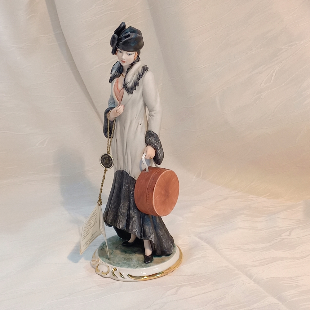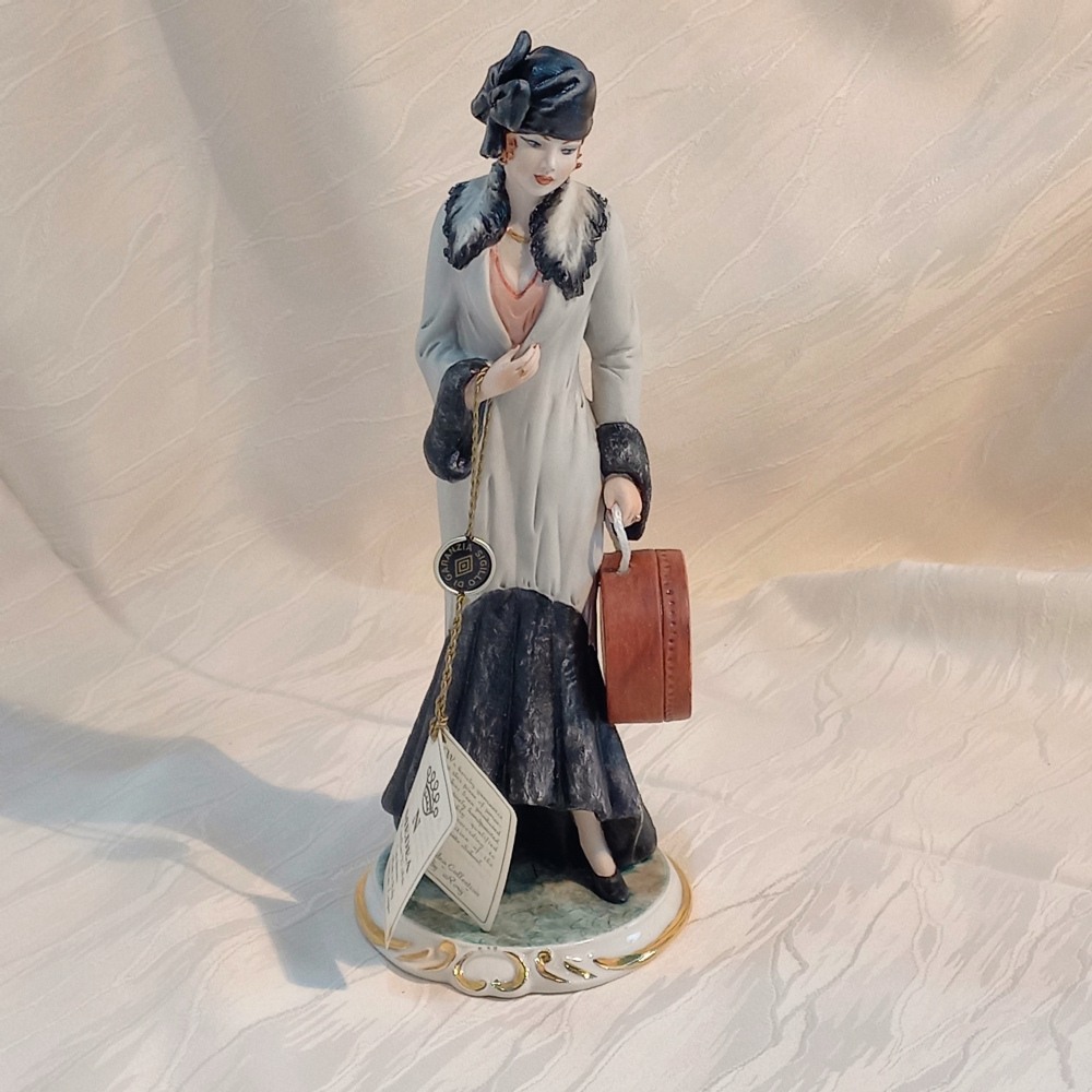 Erede della storica arte di Capodimonte, nata nel XVIII secolo sotto il regno di Carlo III di Borbone e perpetuata con passione da La Medea dal 1967, questa statuina raffigura una figura femminile elegantemente abbigliata, con una cappelliera al braccio, pronta per un'occasione speciale o un viaggio. Ogni dettaglio, dall'acconciatura al sontuoso cappotto con inserti in pelliccia, è reso con una minuziosa cura che testimonia l'eccellenza dell'artigianato italiano.