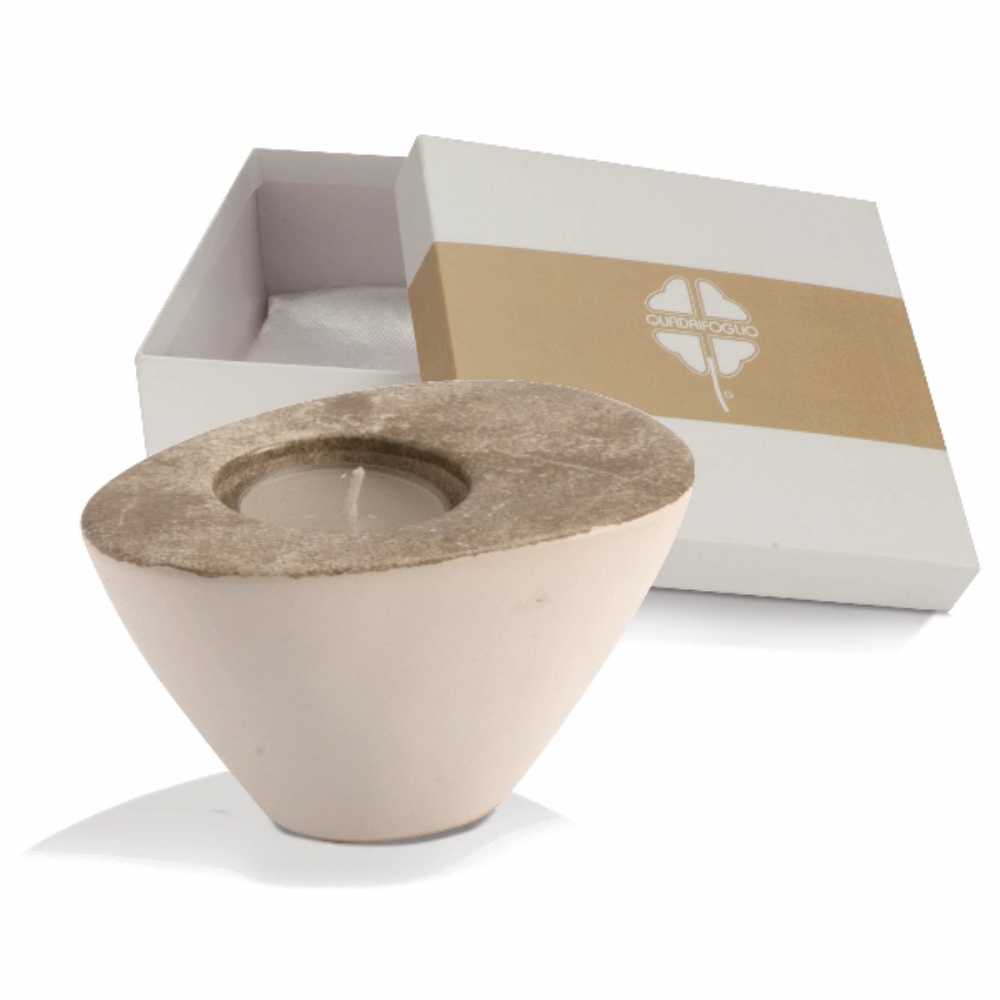 T-Light in porcellana di alta qualità, la superficie superiore è colorata con una tecnica particolare che dà "effetto pietra", l'esterno è bianco