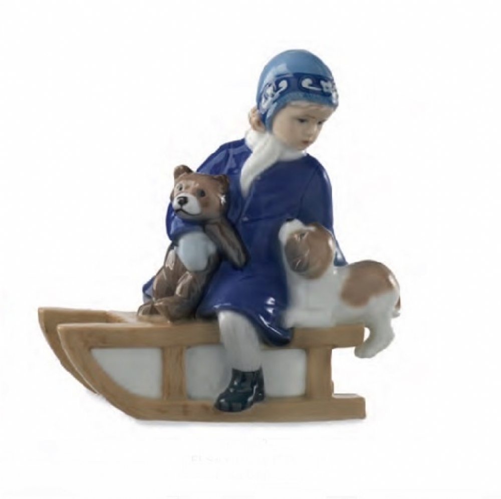 Una nuova Elsa nella collezione di Royal Copenhagen, particolarmente dolce col suo cappottino invernale blu, il suo orsetto e lo splendido cucciolo che vuol salire a tutti i costi sulla slitta.
