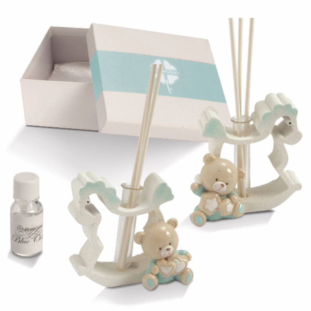 Diffusore in resina a forma di cavallo a dondolo, con orsetto in resina colorata, assortito in due versioni: in uno l'orsetto è nell'angolo a destra, nell'altro è nell'angolo a sinistra.