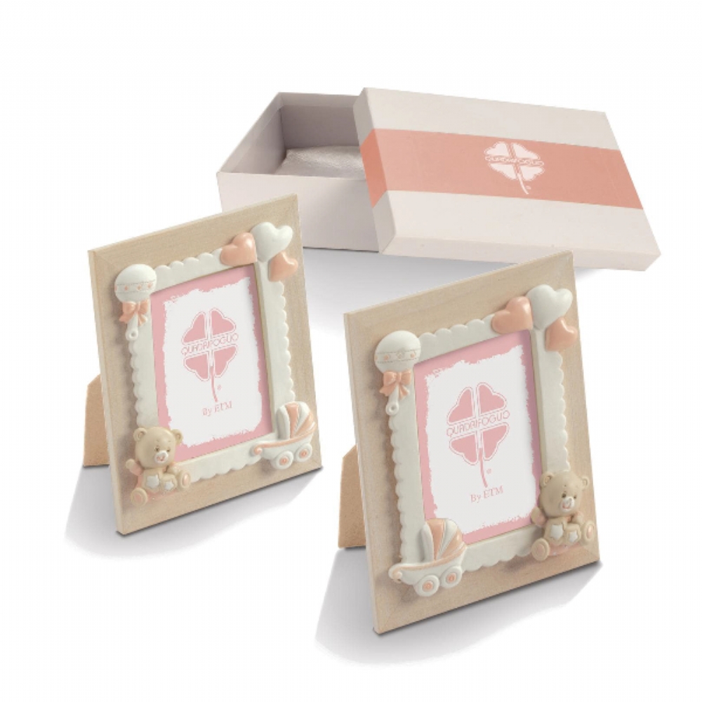 Portafoto in legno con cornice in resina colorata bianco e rosa, assortito in due versioni: in uno l'orsetto è nell'angolo a destra, nell'altro è nell'angolo a sinistra.