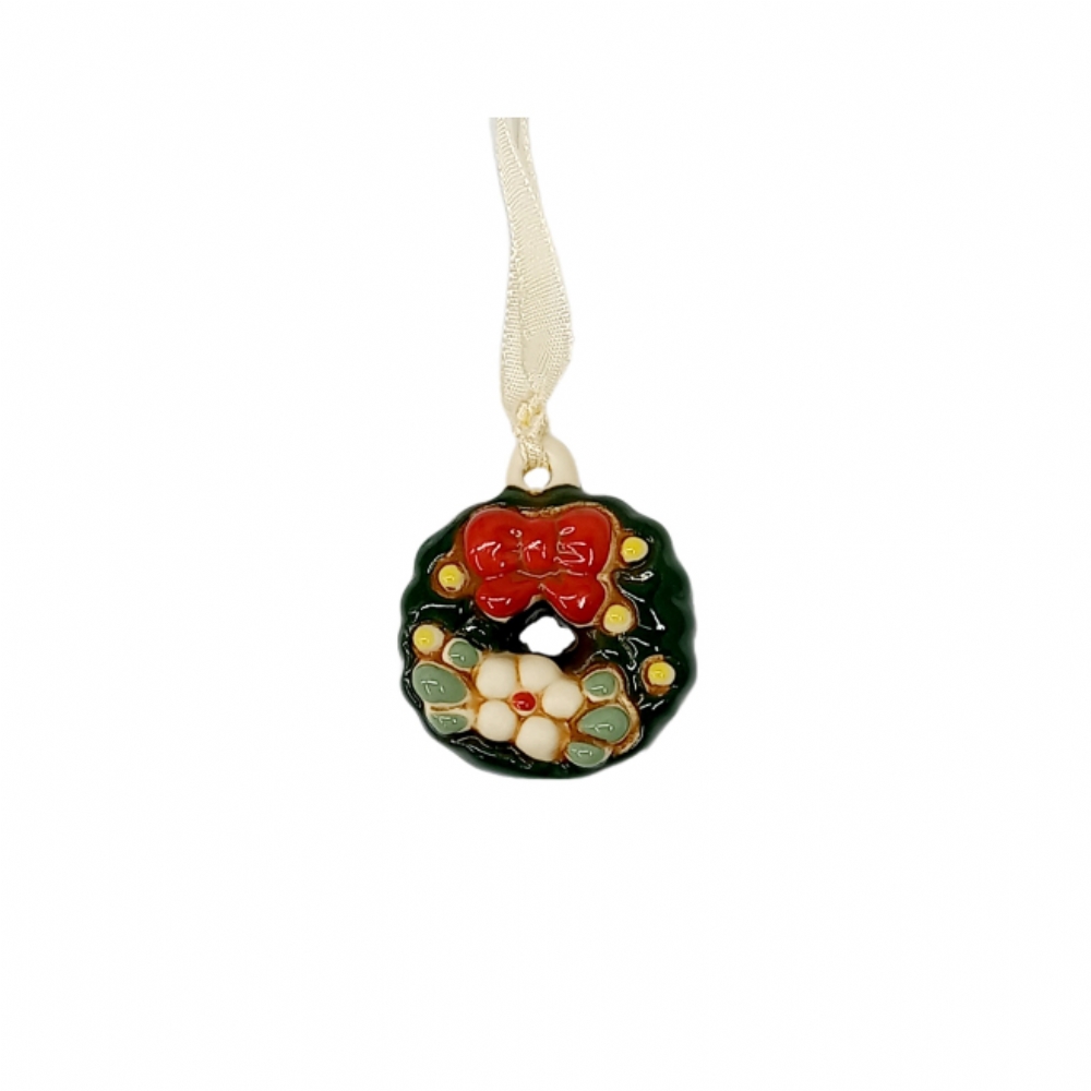 Ogni ghirlanda è un piccolo gioiello dipinto a mano, caratterizzato da una base verde intensa che simula i rami, impreziosita da bacche, foglie decorative e un vivace fiocco rosso al centro. I dettagli finemente curati e i colori brillanti rendono questa miniatura particolarmente realistica e affascinante. È dotata di una comoda fettuccina in raso per essere subito pronta all'uso.