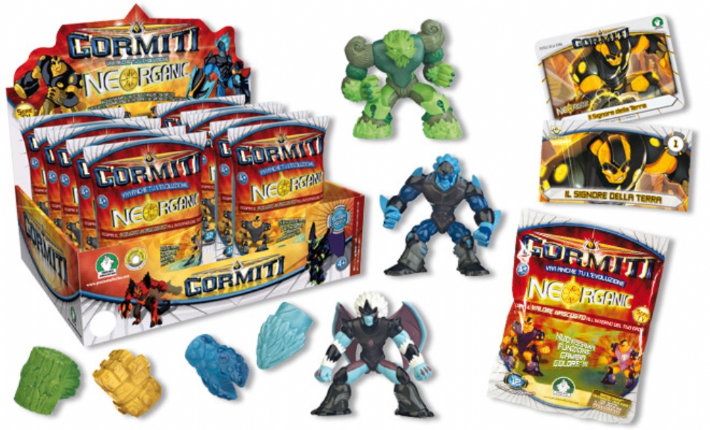Bustina con personaggio Gormiti Neorganic. Il personaggio cambia colore se viene immerso in acqua tiepida o mediante sfregamento.