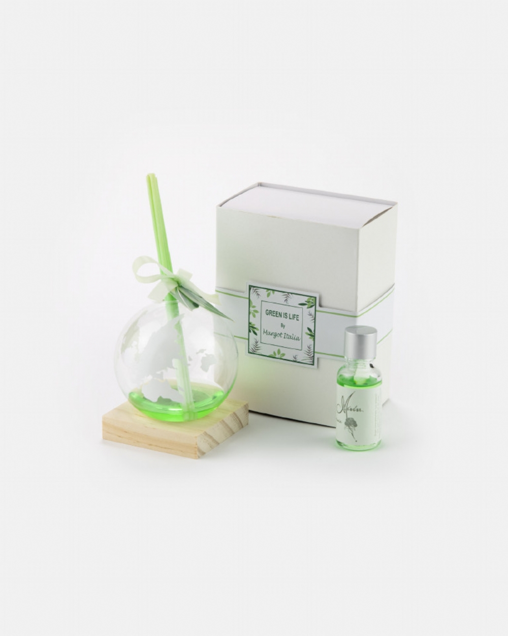 Profumatore d'ambiente in vetro a forma di mappamondo su base quadrata in legno.