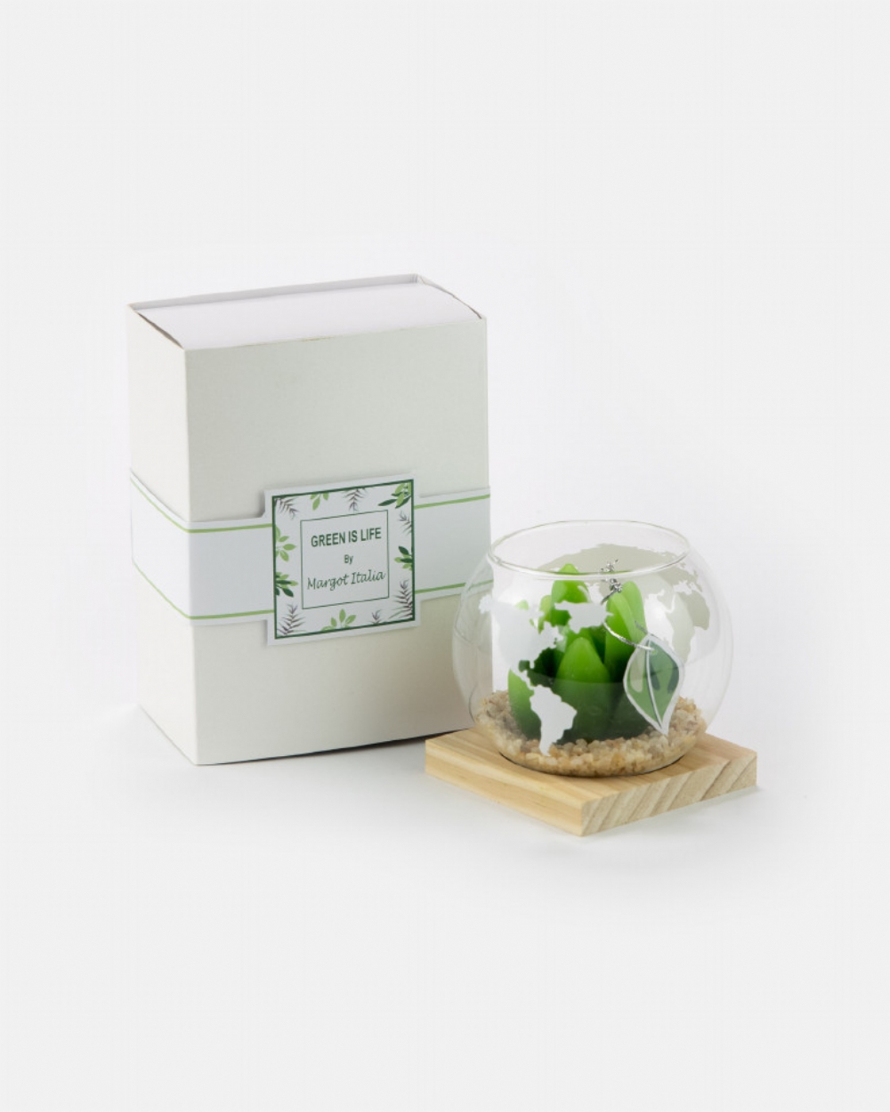 Portacandela in vetro a forma di mappamondo su una base quadrata in legno.