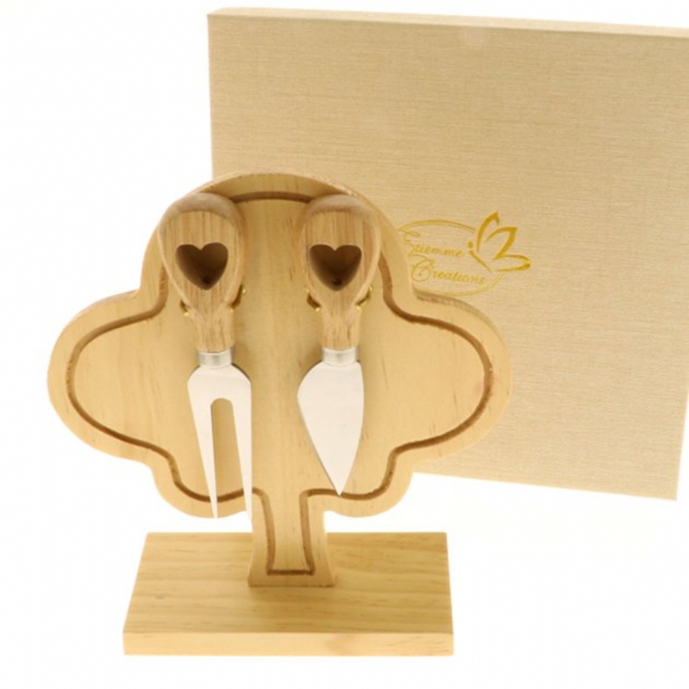 Set da formaggio composto da un un porta coltelli in legno a forma di albero e due coltellini per formaggio.