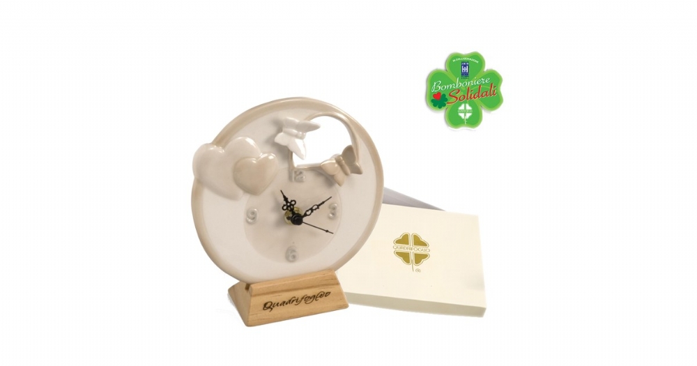 Orologio in porcellana su base in legno, raffigurante una casetta con una coppia di farfalle in rilievo alla finestra