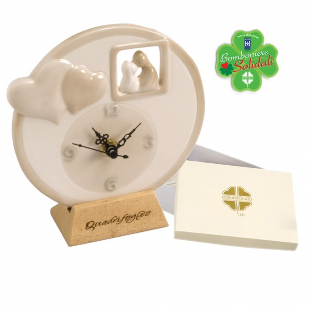 Orologio in porcellana su base in legno, raffigurante una casetta con gli sposi che si affacciano dalla finestra