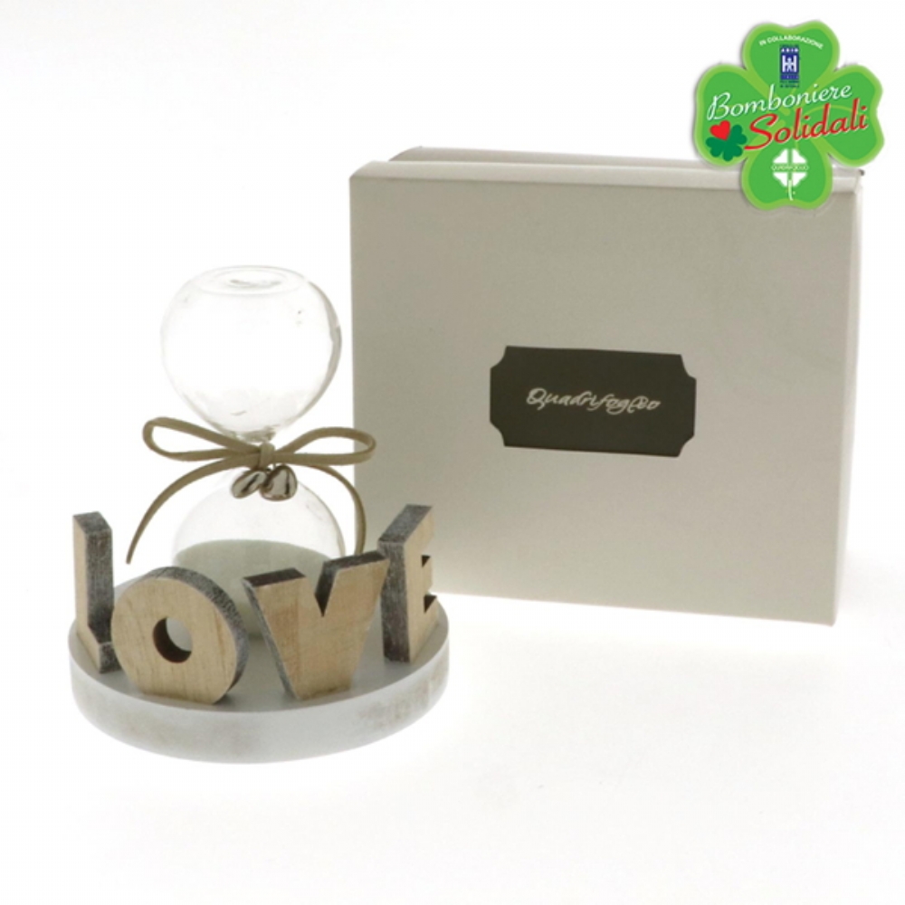 Clessidra in vetro su base in legno con scritta LOVE.