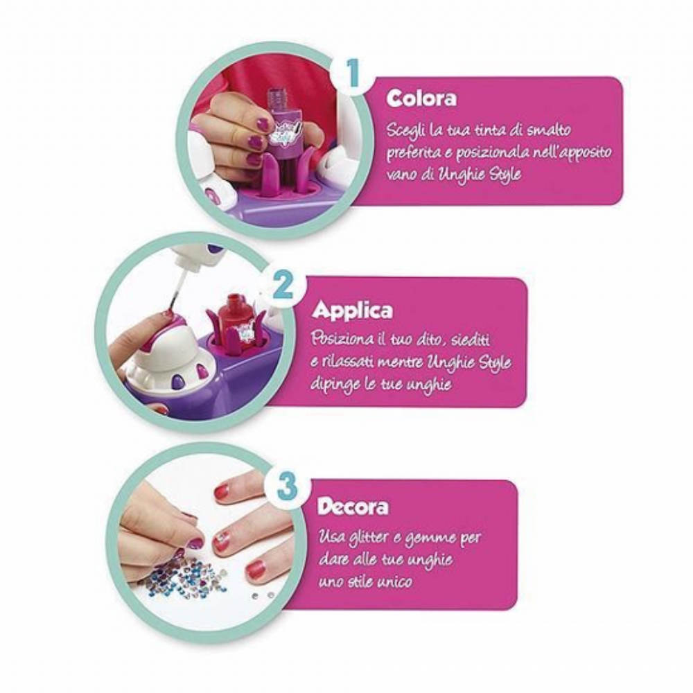 Incluso: Macchina Unghie Style, due smalti, una confezione di glitter, 20 gemme, tre pennelli intercambiabili.