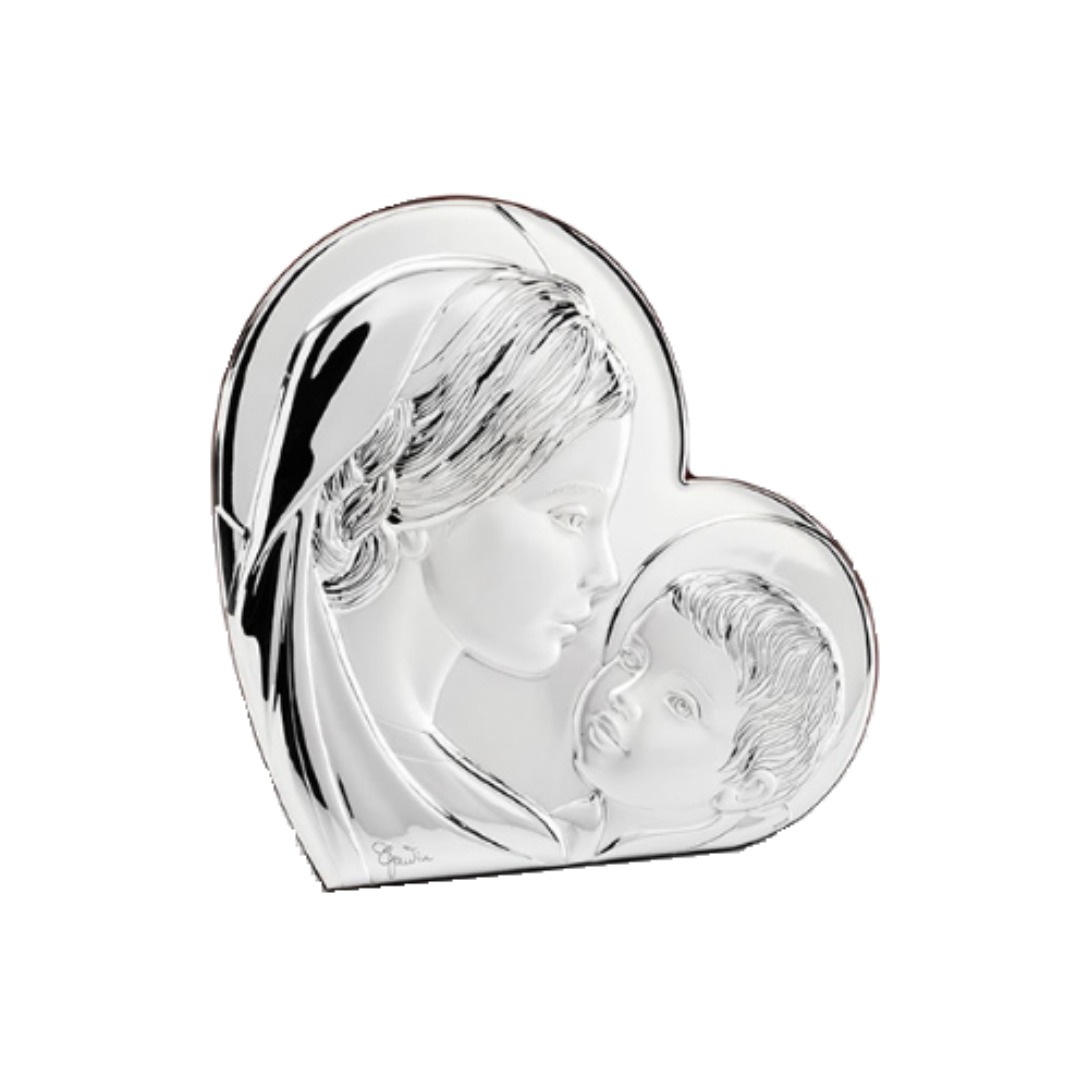 Capezzale Madonna con Bambino in argento bilaminato, trattato con una speciale lacca trasparente che ne maniene inalterato nel tempo lo splendore. Retro in legno scuro, con predisposizione per appendere oppure per appoggiare il capezzale.