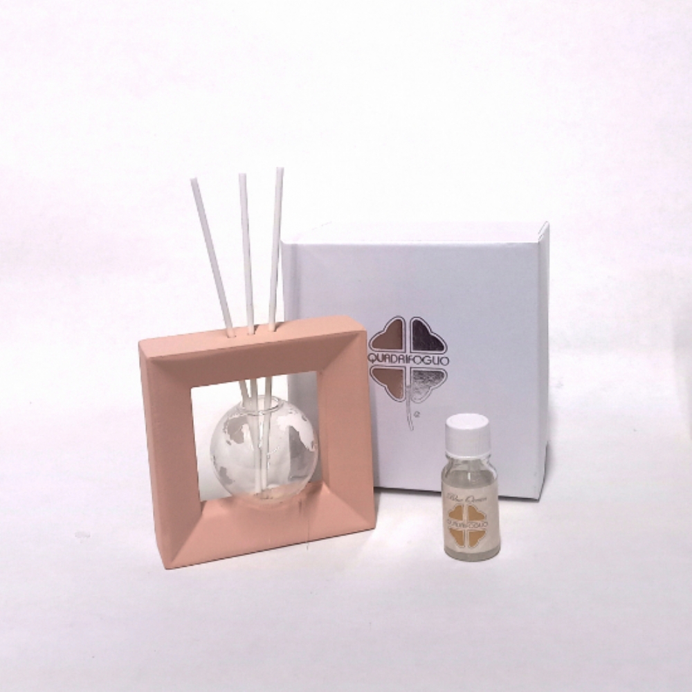 La bomboniera si presenta sotto forma di una struttura quadrata in resina disponibile in tre diversi colori: verde acqua, rosa antico e rosa chiaro. La struttura è progettata per contenere un mappamondo in vetro, dove potrai aggiungere la tua essenza preferita. La parte superiore della struttura è perforata per permetterti di inserire i bastoncini inclusi all'interno.