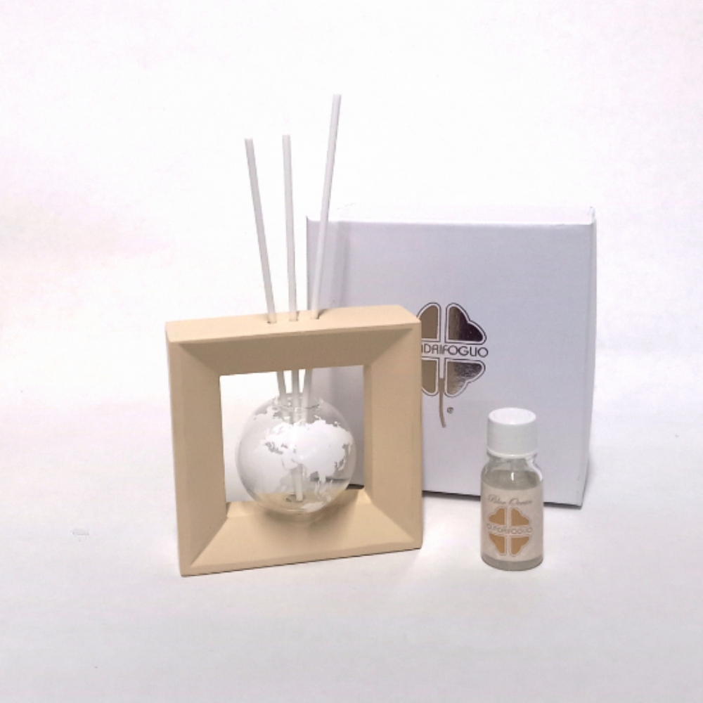 La bomboniera si presenta sotto forma di una struttura quadrata in resina disponibile in tre diversi colori: verde acqua, rosa antico e rosa chiaro. La struttura è progettata per contenere un mappamondo in vetro, dove potrai aggiungere la tua essenza preferita. La parte superiore della struttura è perforata per permetterti di inserire i bastoncini inclusi all'interno.