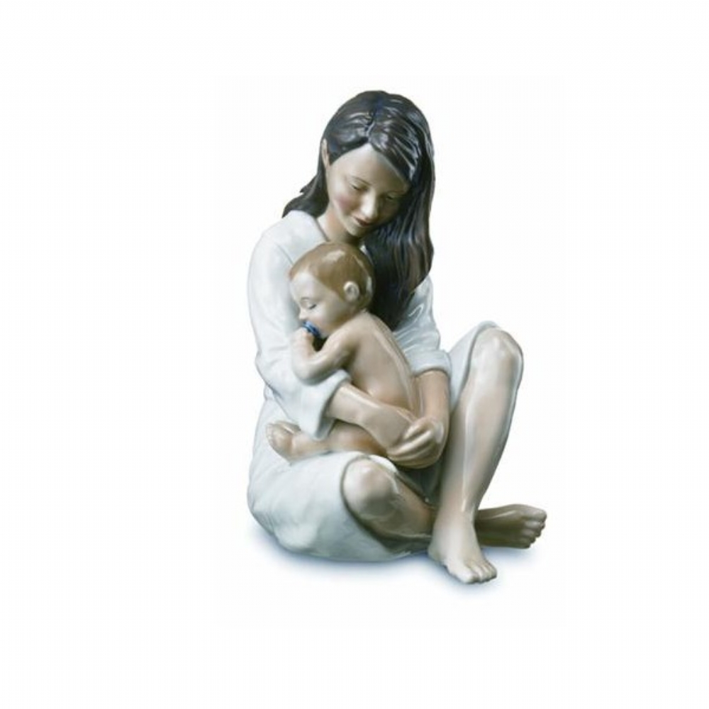 Statuina che raffigura una giovane mamma con i capelli scuri che tiene in braccio un bimbo che dorme con il ciuccio in bocca.