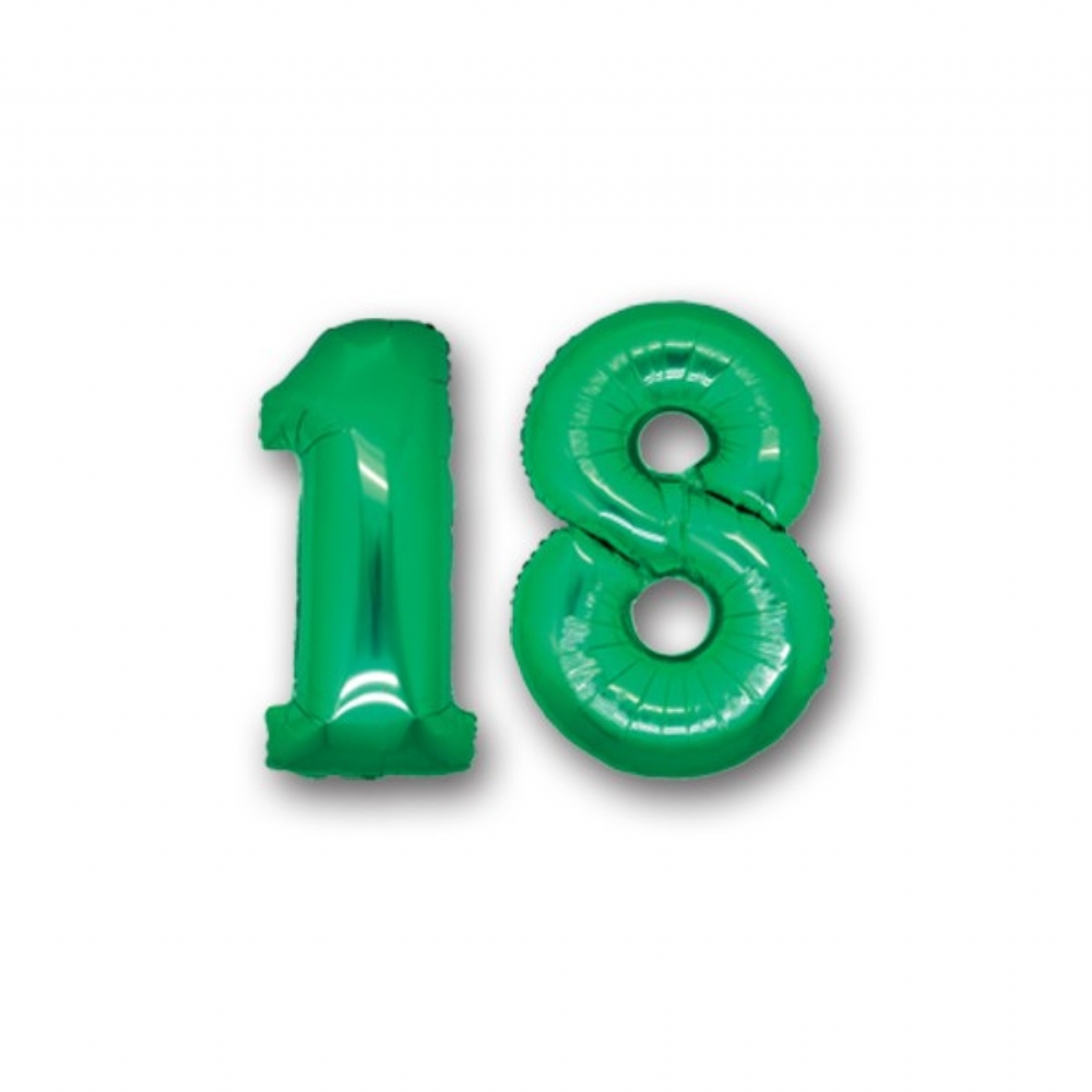Palloncino in Mylar composto da 2 numeri alti cm 100 di colore verde, con i quali si può comporre il numero 18.
