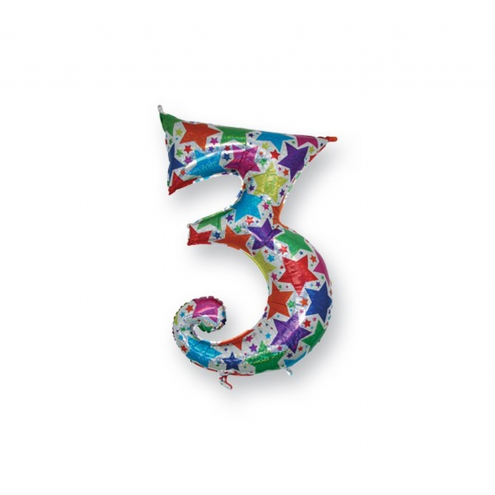 Palloncino in Mylar numero "4" con decoro olografico stelle, alto cm 100 circa.
