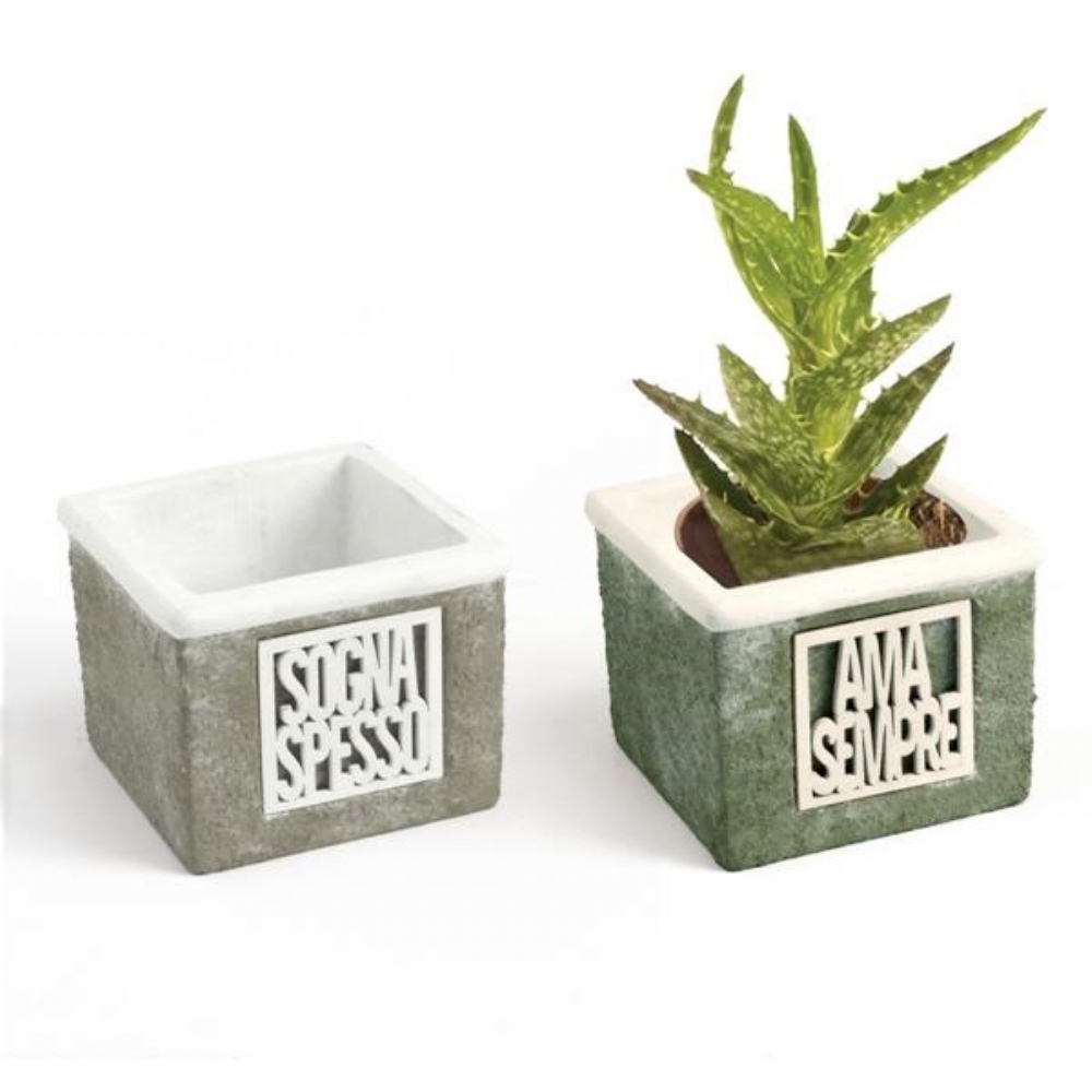Portavaso in terracotta effetto pietra con dedica, assortito in due versioni: una con la dedica "Ama Sempre" e l'altra con la dedica "Sogna Spesso".