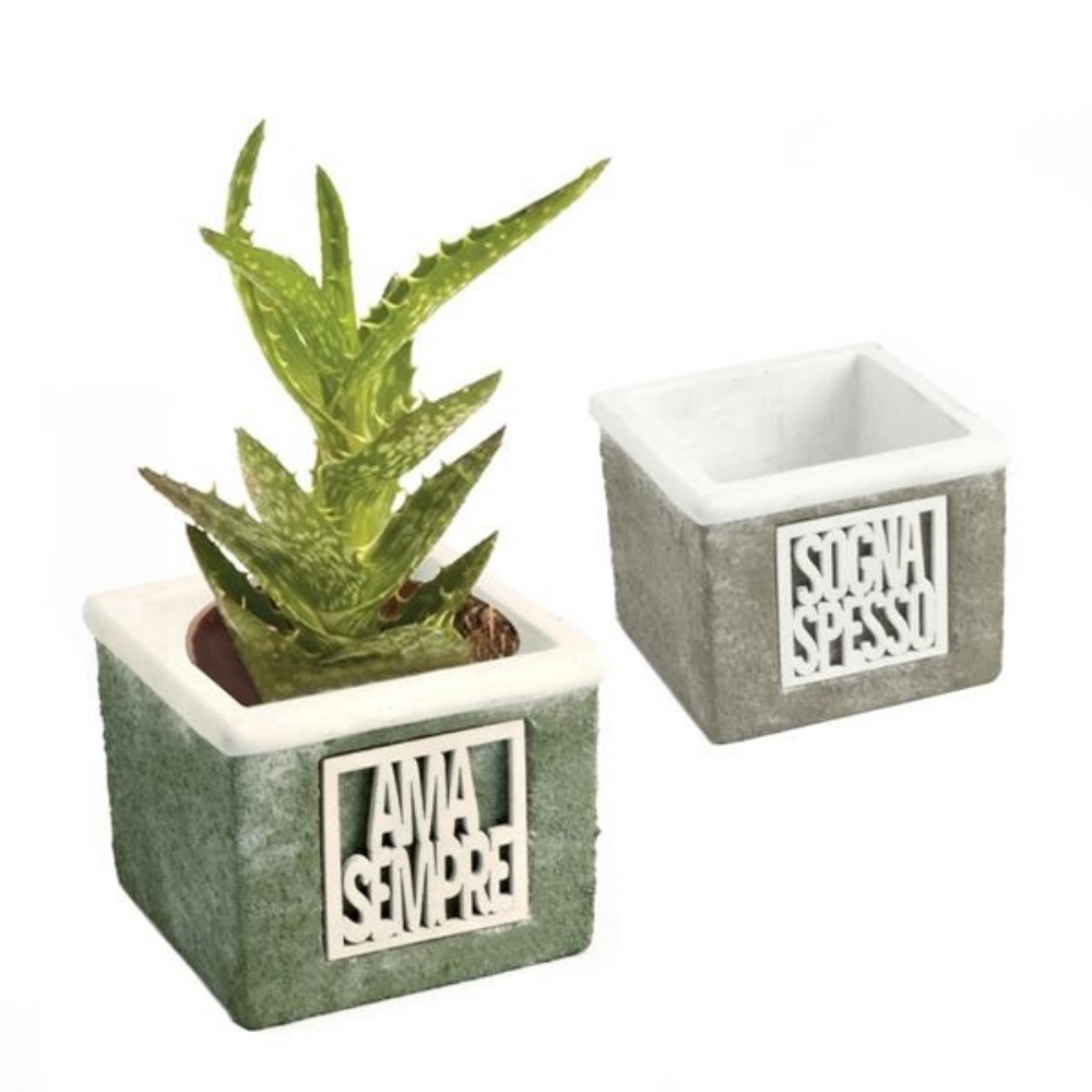 Portavaso in terracotta effetto pietra con dedica, assortito in due versioni: una con la dedica "Ama Sempre" e l'altra con la dedica "Sogna Spesso".