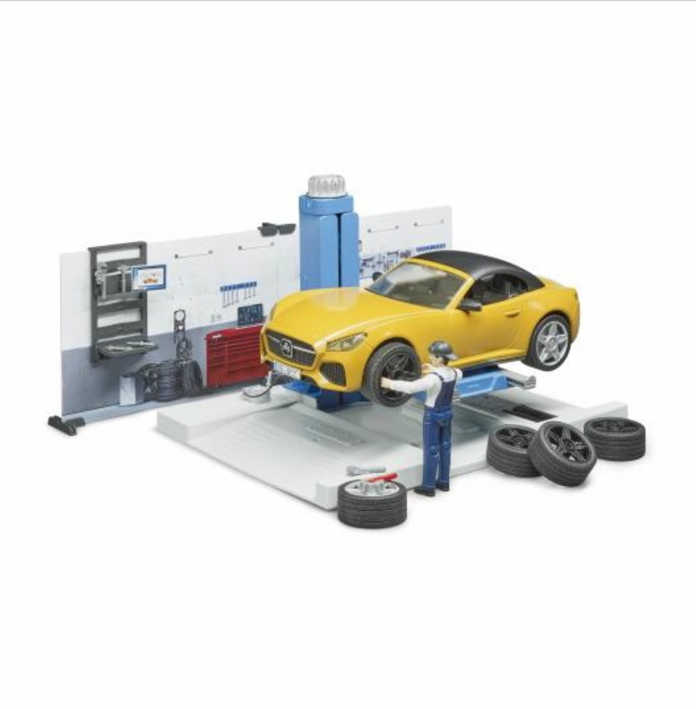 Il meccanico in dotazione può ispezionare i veicoli posizionandoli sul sollevatore ed eseguire una diagnosi ed un cambio di gomme grazie agli strumenti presenti sul set.