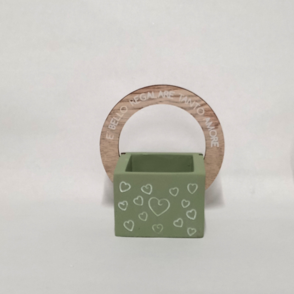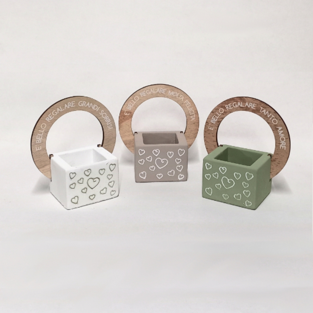 Il fantastico porta piante è disponibile in tre colori (bianco, beige e verde chiaro) ed è impreziosito da un arco in legno a forma di foglia con le parole "è bello regalare tanto amore ", "è bello regalare grandi sorrisi " o "è bello regalare tanta felicità ".