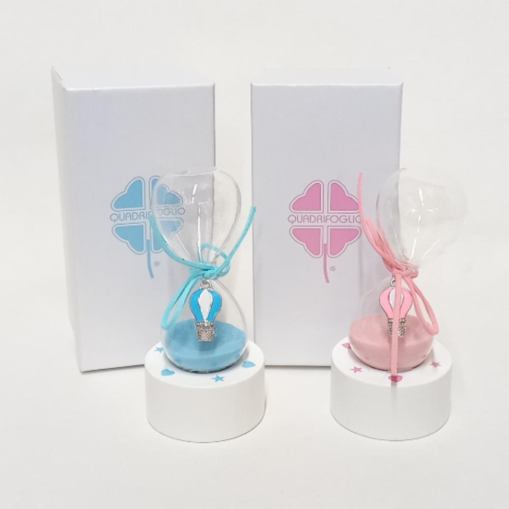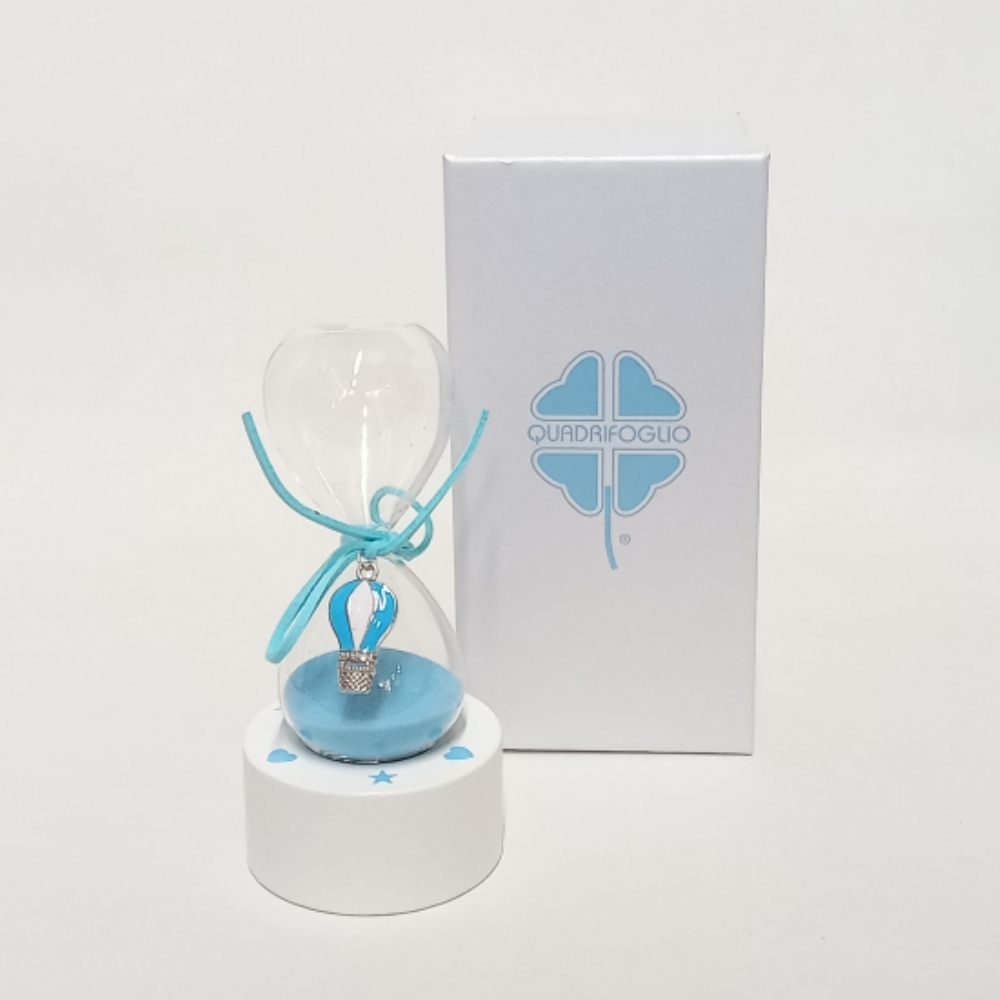 La clessidra è in vetro trasparente e la sabbia al suo interno è celeste, abbinata a un laccio che si avvolge al centro per contenere la bellissima applicazione a mongolfiera. La base è in legno bianco e decorata con stelle celeste sulla parte superiore.