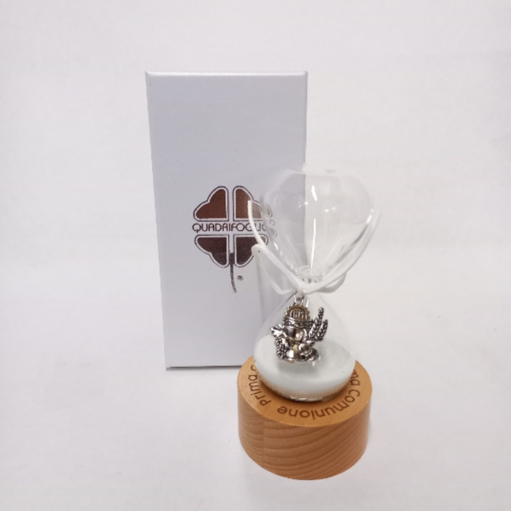 La clessidra è in vetro trasparente e la sabbia al suo interno è bianca, abbinata a un laccio che si avvolge al centro per contenere la bellissima applicazione del calice con la spiga e l'uva, simbolo della comunione. La base è in legno con la scritta "comunione" sulla parte superiore.